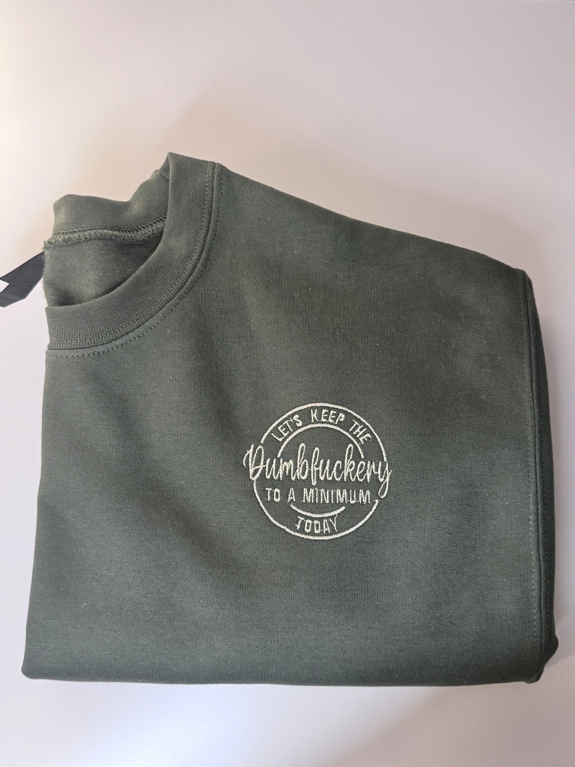 A bold and playful green sweatshirt, designed for those days when a little humor goes a long way. This sweatshirt features the cheeky phrase "Let's Keep the Dumbfuckery to a Minimum Today" embroidered in a stylish font.