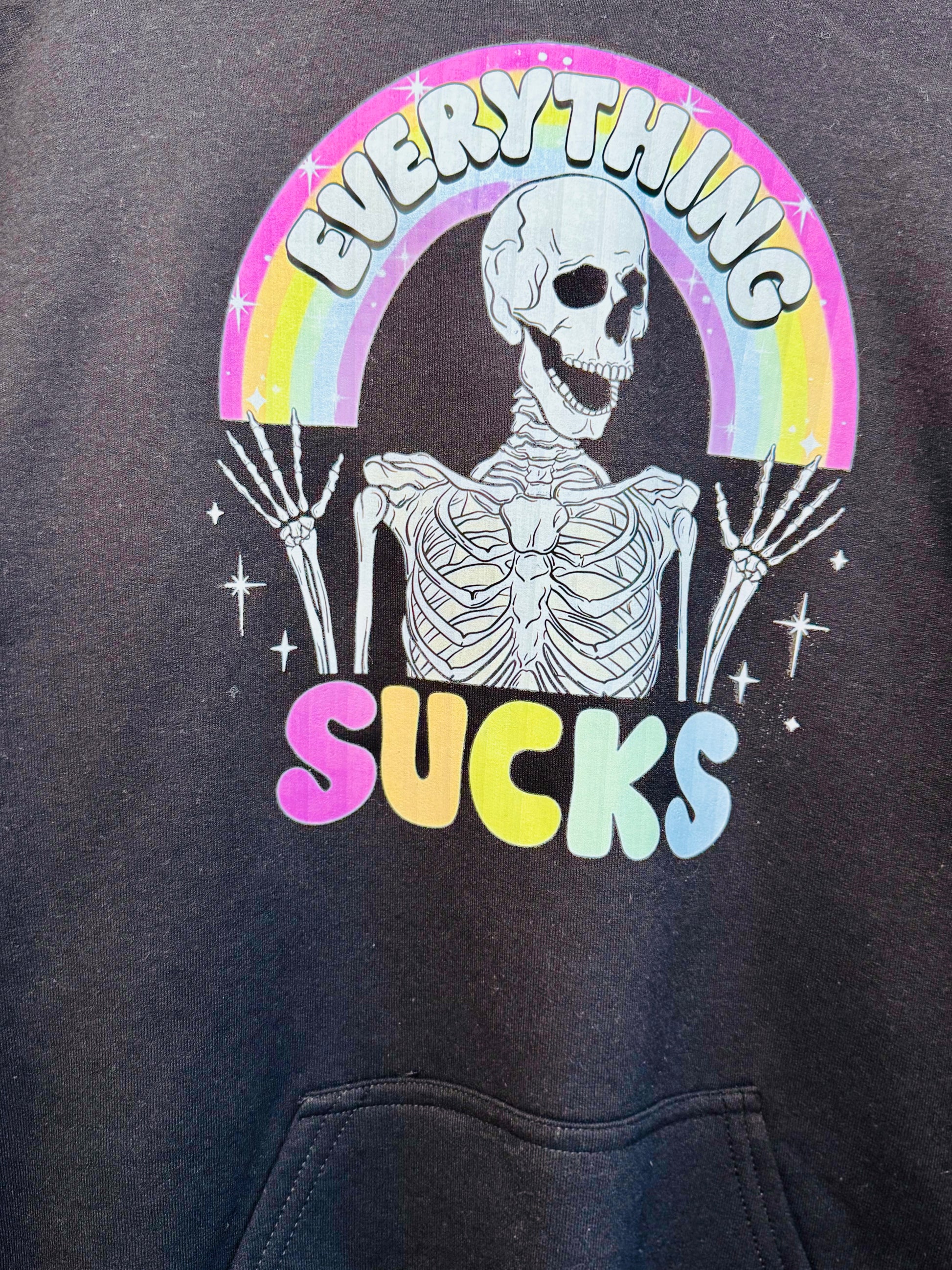 This black hoodie features a bold and edgy design. The phrase “EVERYTHING SUCKS” is printed across the chest in playful, bubble-style font with a gradient of bright colors, creating a striking contrast. Comfortable and stylish, this hoodie is perfect for those who love a mix of dark humor and vibrant aesthetics.