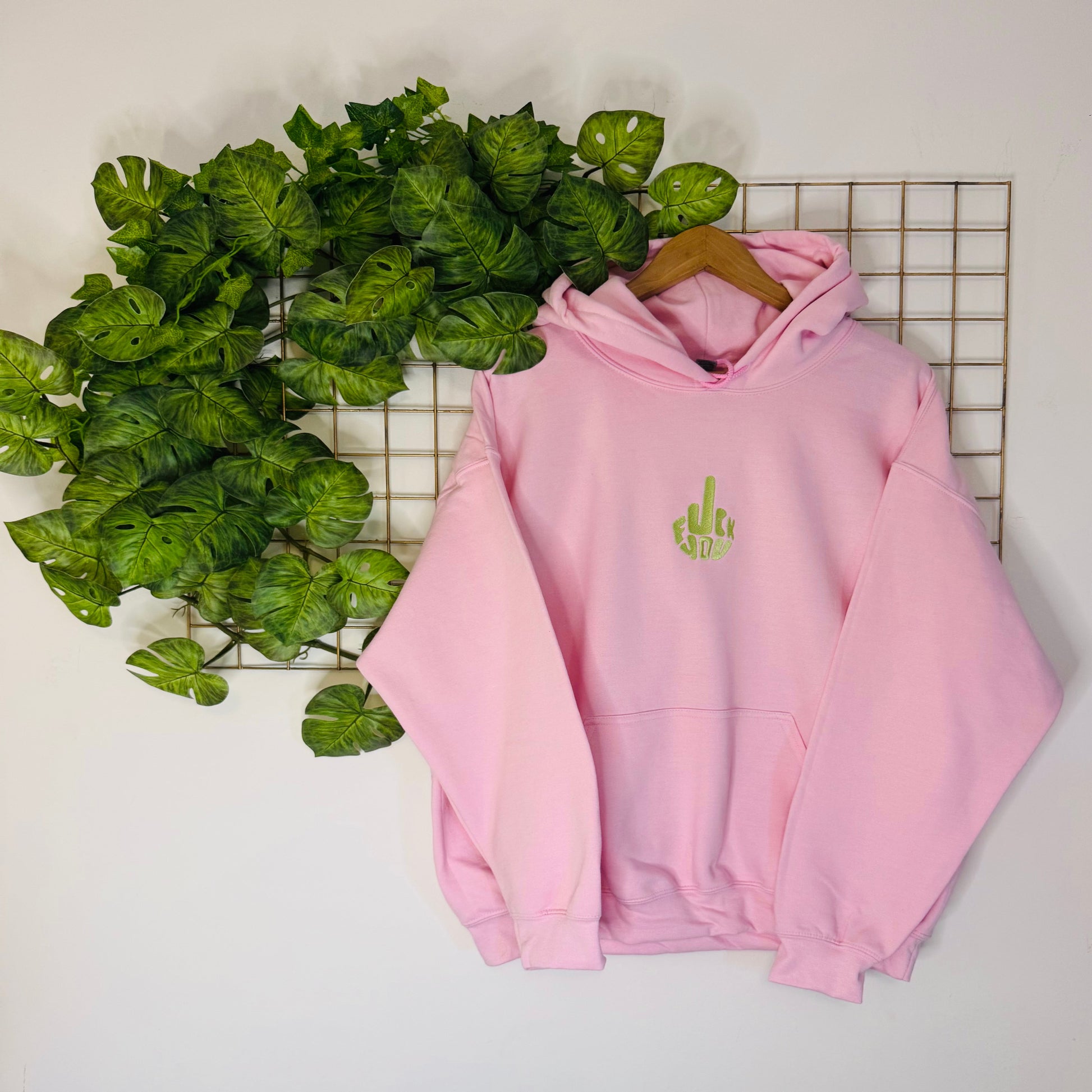 Our edgy pastel pink hoodie, a bold statement piece that combines softness with a touch of attitude. This hoodie features the striking phrase "F*ck You" embroidered in vibrant green thread, creating a sharp contrast that catches the eye.