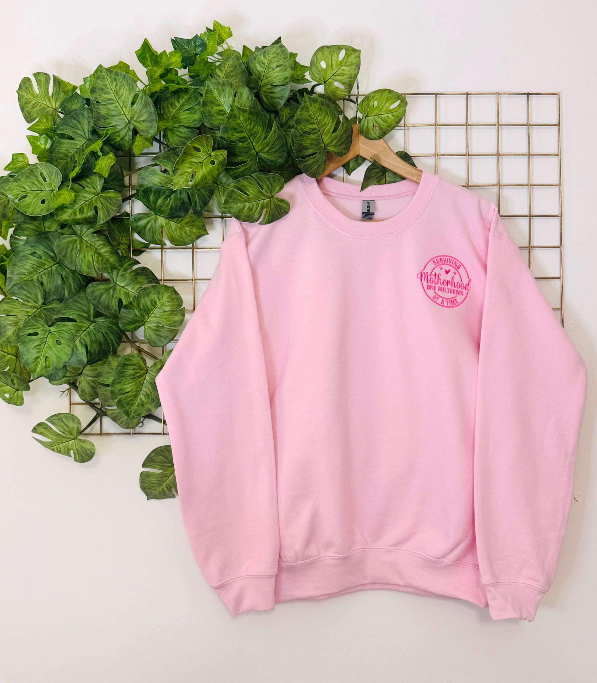 A must-have for every resilient mom navigating the beautiful chaos of parenthood. Crafted from soft, cozy fabric, this sweatshirt features the heartfelt and humorous phrase "Surviving Motherhood One Meltdown at a Time" embroidered in an elegant script.