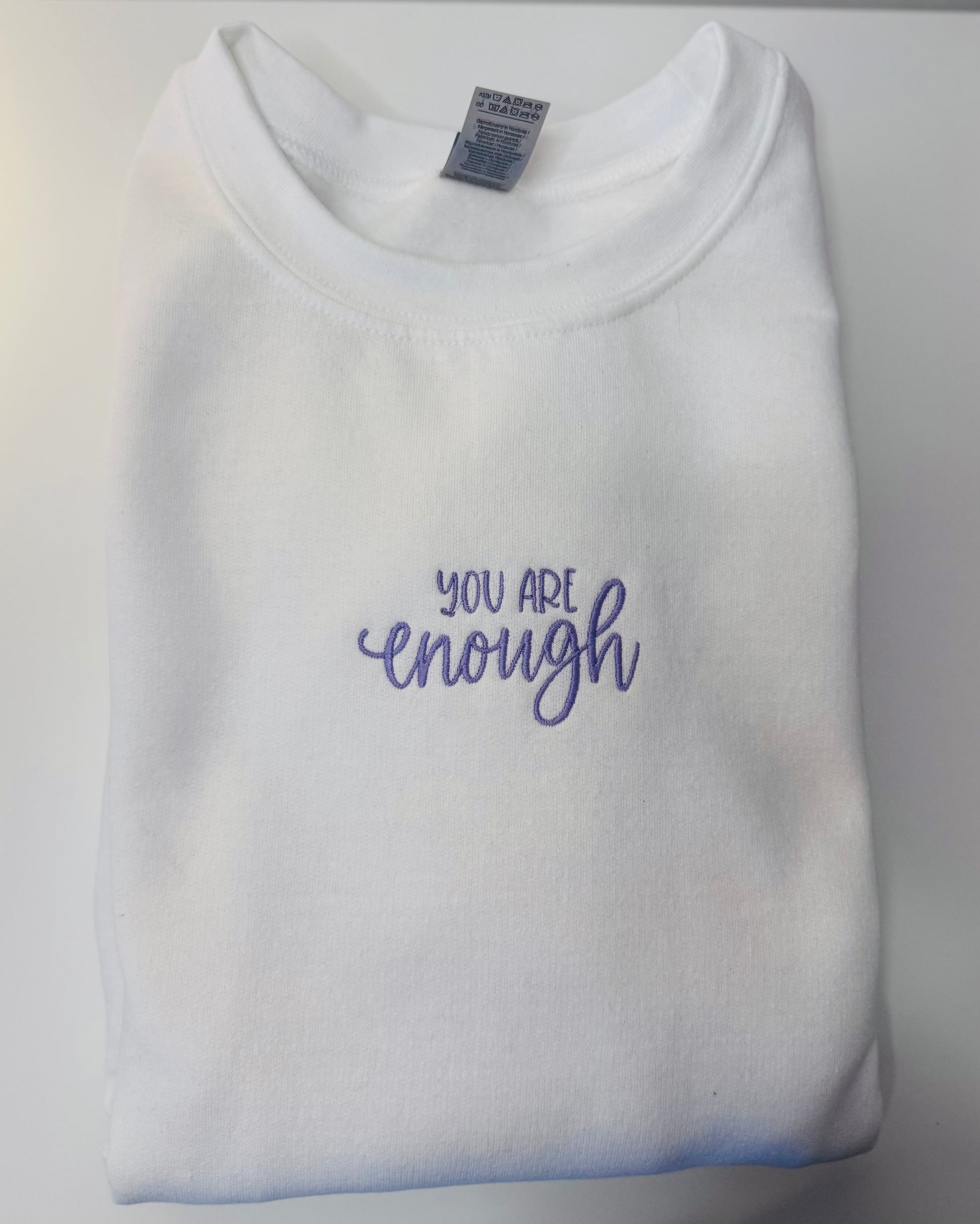 "You Are Enough" sweater, a cozy and uplifting piece designed to wrap you in warmth and positivity. This sweater features a Luscious lilac threat that beautifully complements its embroidered message. The delicate stitching of "You Are Enough" serves as a constant reminder of self-worth and empowerment, making it not just a garment, but a statement of self-love.